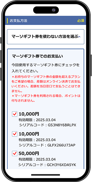 お持ちのマーソギフト券の金額を超えるプランをご希望の場合は、
