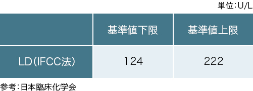 2020年4月1日以降、LD(LDH)の測定方法は国際臨床化学連合の「IFCC法」に変更されました。新たなLD(LDH)の基準値は、成人男女で124~222 U/L(ユニットパーリットル)です(日本臨床化学会より)。