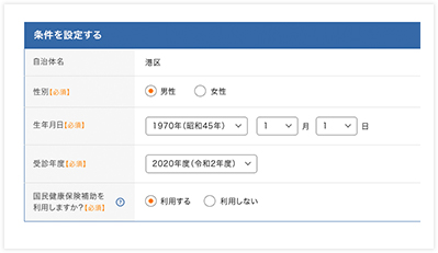 1お客さまの情報を設定の上、受診可能な検査を表示協会けんぽでは、検査によって受診可能な対象条件が異なります。受診可能な検査を表示するため、お客さまの情報を設定してします。