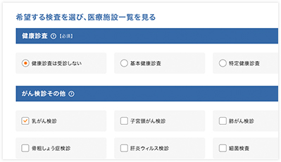 マーソでは、お客さまの生年月日等を設定すると受診可能な検査が表示されますので、ご希望の検査、医療施設を選択しご予約ください。
