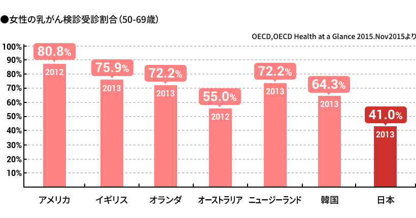 アメリカなど他の先進国と比較して日本でがん患者が減少しない理由のひとつに「がん検診の受診率の低さ」が考えられています。厚生労働省によると、たとえば日本の乳がん検診と子宮頸がんの受診率は4割とアメリカの2分の1程度で、これは先進国のなかでも極めて低い数値です。